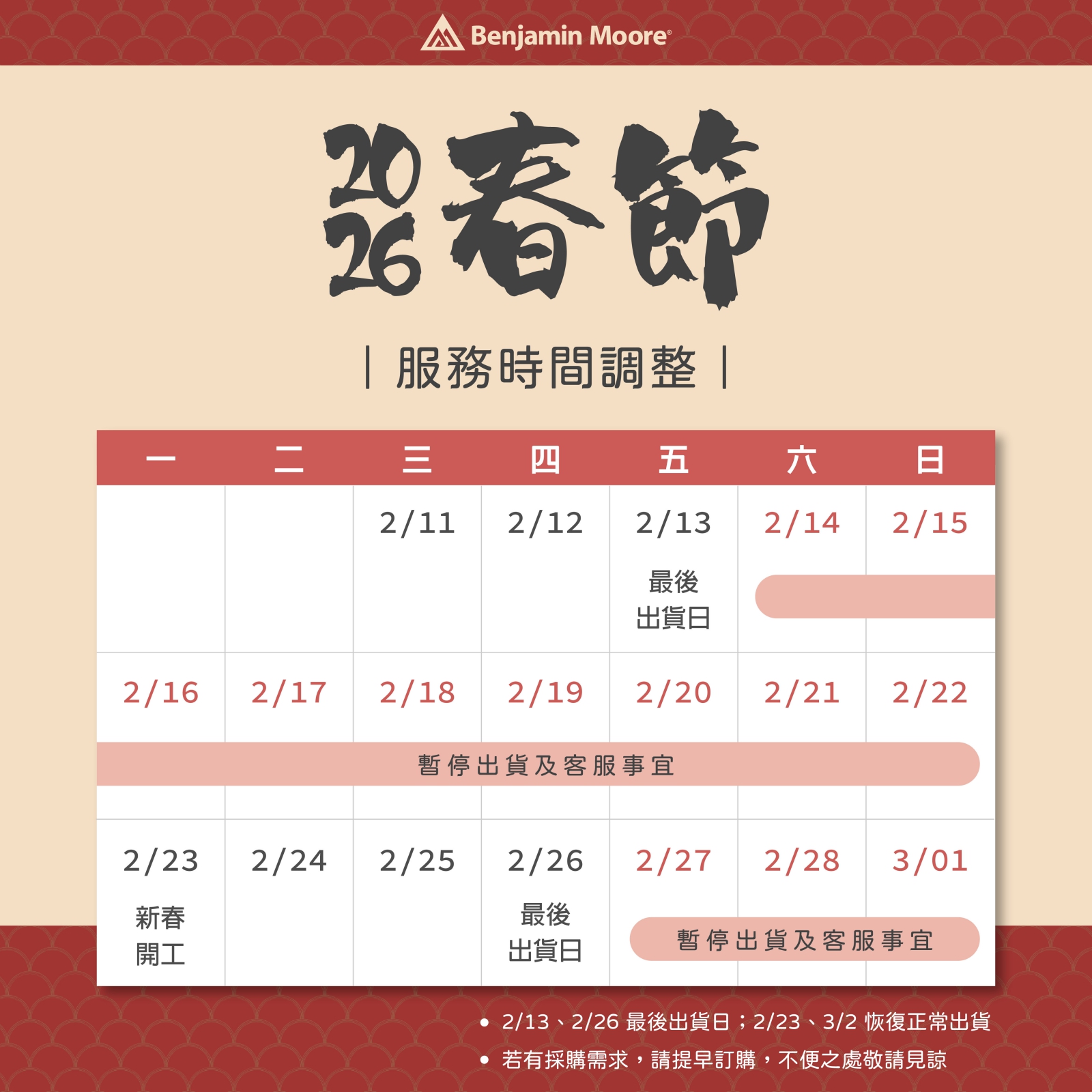 適逢春節與 228 和平紀念日連假,本公司出貨及客服時程調整如下