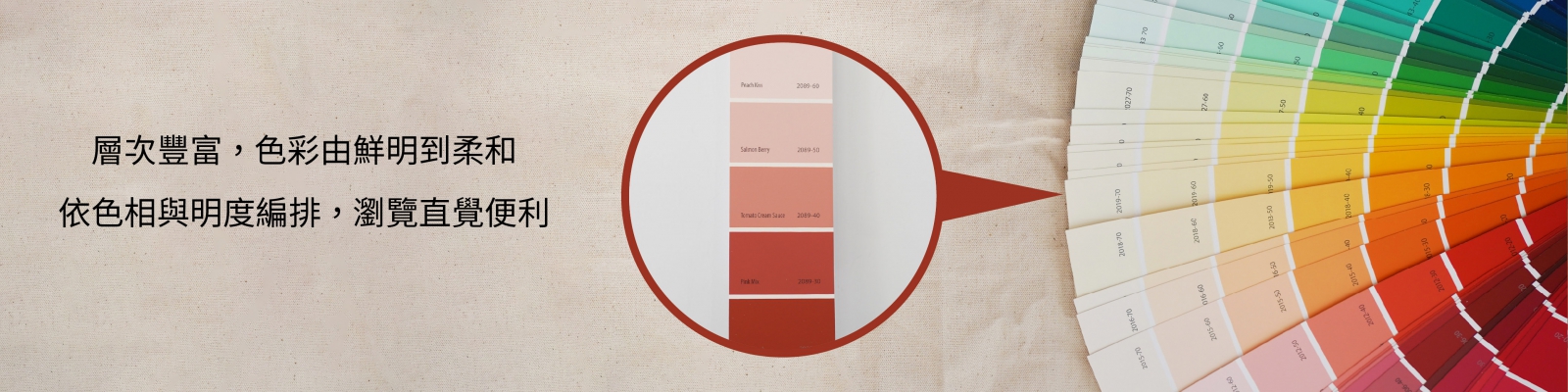 • 依色相與明度編排,瀏覽直覺便利